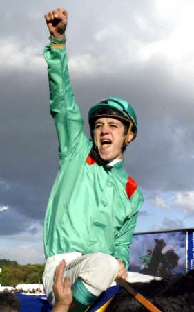 Belgian Jockey Christophe Soumillon riding Dalakhani, owned by the Aga Khan, reacts as he wins the Prix de l'Arc de Triomphe at Longchamps horse track, near Paris, October 5, 2003. REUTERS/Philippe Wojazer