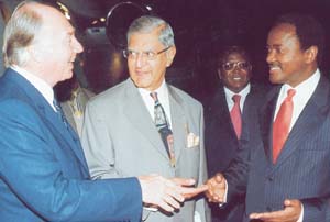 The Aga Khan, the spiritual leader of the Shia Ismaili Muslims being is welcomed by the Foreign Affairs Minister Kalonzo Musyoka on his arrival in the country at the Jomo Kenyatta International Airport in Nairobi last night.