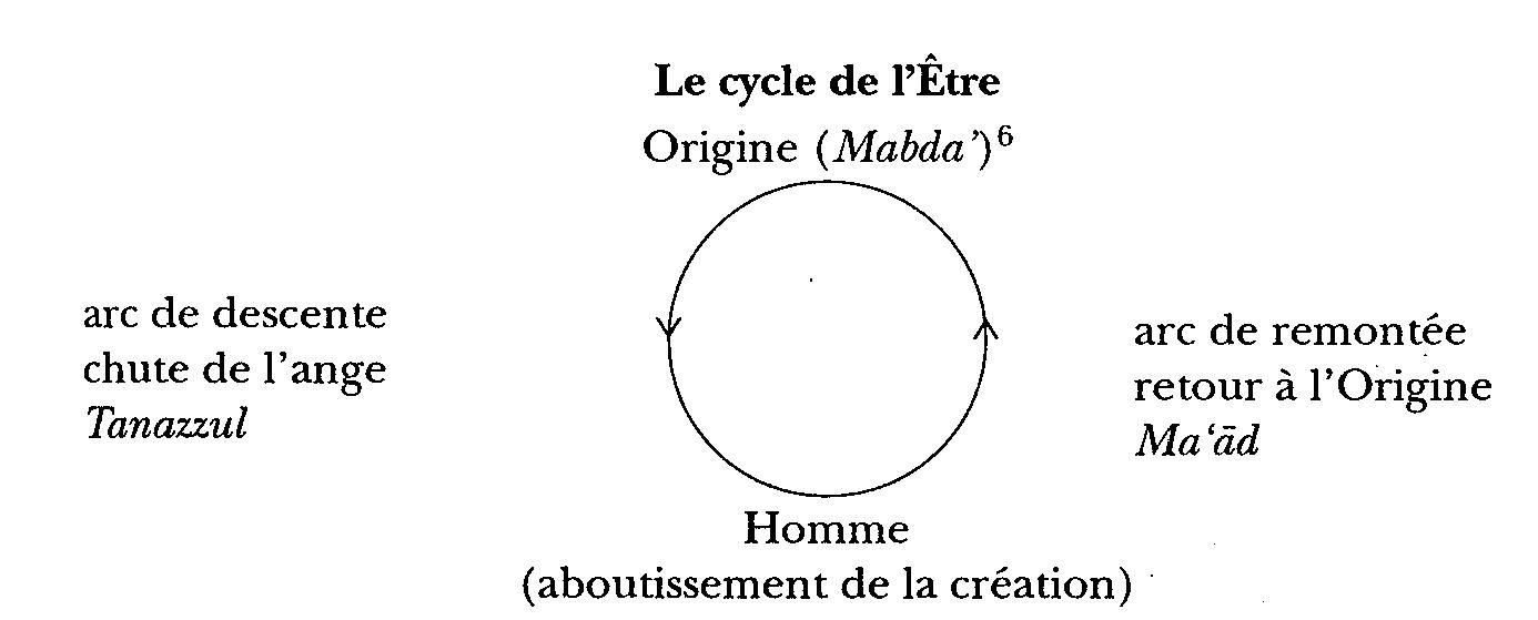À partir de l'homme s'effectue le retour au premier Être, symbolisé par l'arc de remontée. Le cycle de l'existence commence à l'Origine en suivant l'arc de descente jusqu'à l'homme, puis retourne à l'Origine (premier Être). L'âme humaine cherche à remonter les degrés de la hiérarchie pour retrouver son Seigneur (Malik) grâce au Nom divin (Ism). L'être humain, ayant été conçu à l'image de Dieu, n'a qu'à se connaître lui-même pour connaître son Seigneur. La Déité est au-delà du cycle de l'être et donc un voile la sépare du plérôme spirituel. Au sommet du plérôme spirituel se trouve l'Intellect primordial qui est l'Origine (Mabda' )6