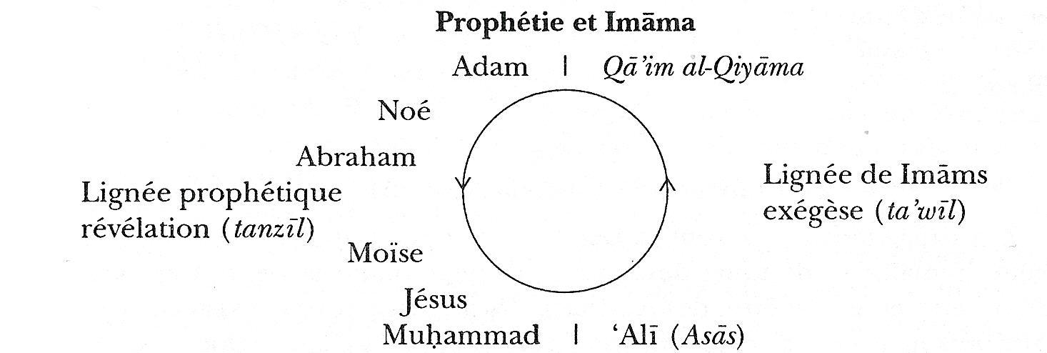 Le cycle de l'être peut être compris en faisant intervenir les notions de Prophétie et d'Imama. L'arc de descente symbolise la révélation (tanzil ) qui est la descente de la vérité (haqiqa) du monde supérieur au monde inférieur. L'arc de remontée symbolise l'exégèse spirituelle (ta'wil ) qui consiste en un retour à la signification originelle. Dans le cycle de la révélation, le Prophète est l'Énonciateur (Natiq) d'une nouvelle révélation (risala) alors que l'Imam est silencieux (samit).