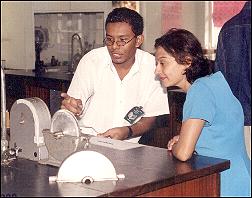 a Form Four student, explains his Physics project on water turbines to Chairperson AKES Mombasa Mrs. Narmin Somji (right) during the Aga Khan Junior Academy and Aga Khan Kenya Secondary Schools' Open Day which was held recently.