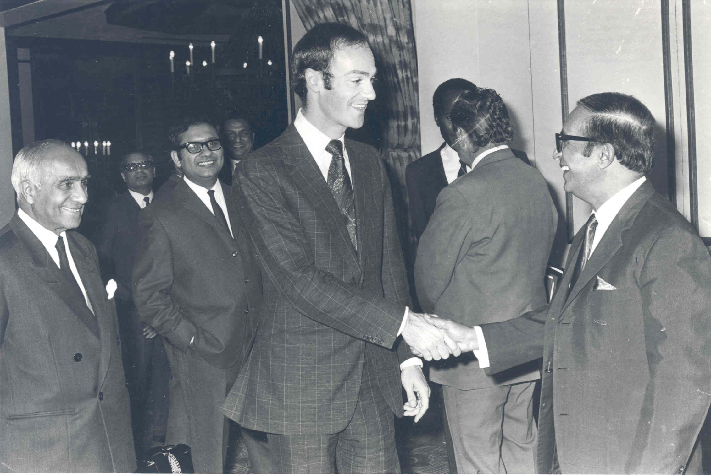 July 1, 1971 - Assistant Minister for Tour and Wildlife Mr. Jan Mohamed Shakes hands with Prince Amyn Mohamed after launching yest. of 200,000 francs tourism game Lodge and Hotel project.