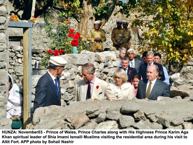 2006, November 03 - Hunza, Pakistan: Prince Karim Aga Khan (R) and Britain Prince Charles (2L) and his wife Camilla (C) visit the residential area of 900-year-old fort in the northern village of Altit Fort, 03 November 2006. Prince Charles and his wife Camilla visited the remote Karakoram mountain range and were presented with a yak by villagers on the last day of their trip to Pakistan, officials said. AFP PHOTO/HO/ ASSOCIATED PRESS OF PAKISTAN-GETTY OUT