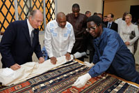 His Highness the Aga Khan and President Amadou Toumani Touré of Mali reviewing tapestry work being restored in a new conservation lab built under an agreement between the National Museum of Mali and the Aga Khan Trust for Culture dedicated to organising the Museum’s reserve collections of archaeology and textiles and epxanding the Museum's restoration capabilities. Photo Credit: Gary Otte